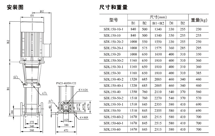 南元SDL150/SDLT150立式多級離心泵有不同的泵規格和不同級數,以滿足所需的流量和壓力。