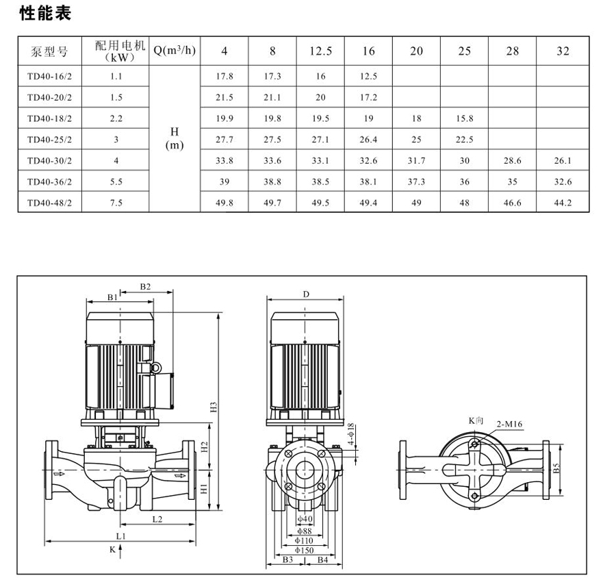 TD40系列單級管道離心泵,配有標準電 機和機械密封。此類產品的結構與相近類型產品相比,更不易受到泵送液體中雜質的影響。產品設計為頂部可拉出的拆裝形式,其可 以在不影響管路系統的情況下對泵進行維修。所有泵采用創新式便拆式機械密封,更好機械密封無需拆卸電機。
